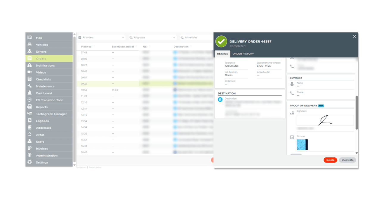 Affichez toutes les tâches planifiées dans le module de gestion des livraisons, avec une colonne dédiée pour suivre l'état des preuves de livraison. Recevez des alertes en temps réel dans Gamma Tracking ou par e-mail à la fin de chaque étape, de la prise en charge du colis à la livraison de ce dernier. Accédez instantanément à tous les détails de la preuve de livraison, y compris les signatures, les photos et les notes, directement depuis votre tableau de bord.
