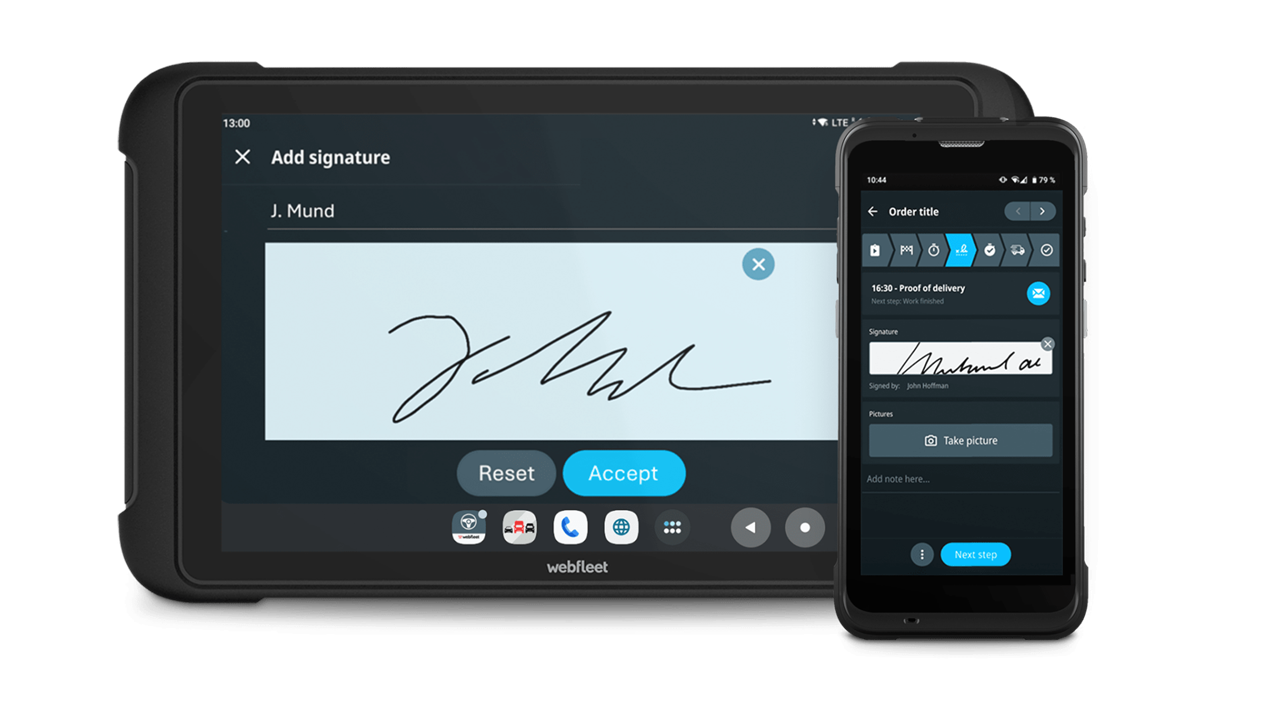 Améliorez l'expérience client en partageant les détails du transport et de la livraison avec les clients via un document numérique. Assurez l'organisation de vos fichiers en téléchargeant un résumé au format PDF de chaque mission terminée avec les horodatages, les détails de la mission et la preuve de livraison jointe. Stockez et accédez à tous les détails de vos commandes et livraisons via Webfleet ou via l'API. Libérez-vous du papier pour éliminer les recherches manuelles et accélérer votre processus de la commande à l'encaissement.