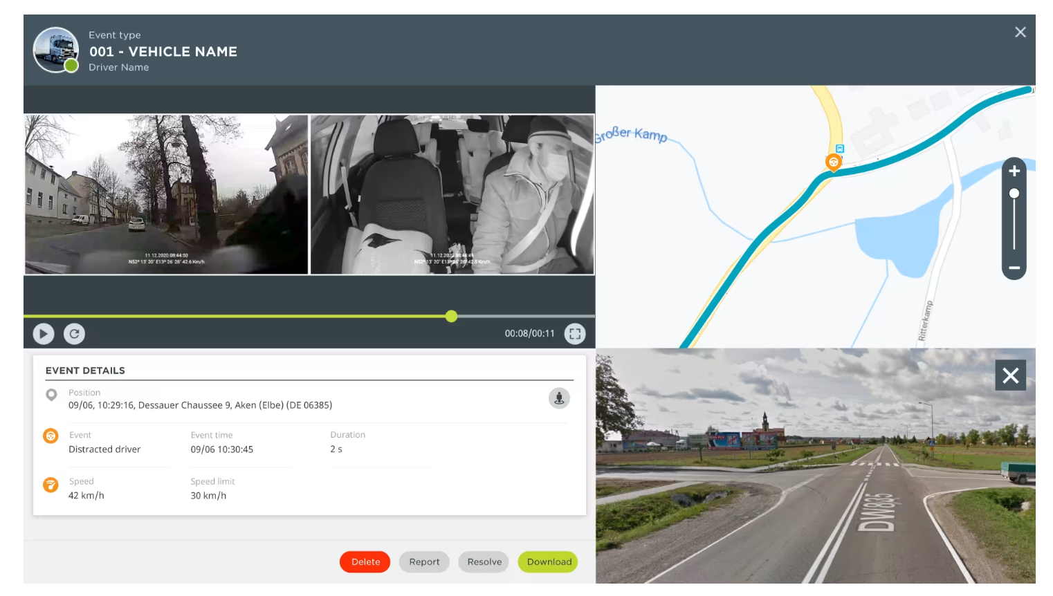 Les vidéos de la caméra embarquée HD s'affichent avec les données de conduite de votre flotte (position GPS, conducteur, vitesse). Vous pouvez ajouter des commentaires pour capturer le contexte supplémentaire recueilli auprès des conducteurs, par exemple un freinage brusque dû à un piéton qui traversait.